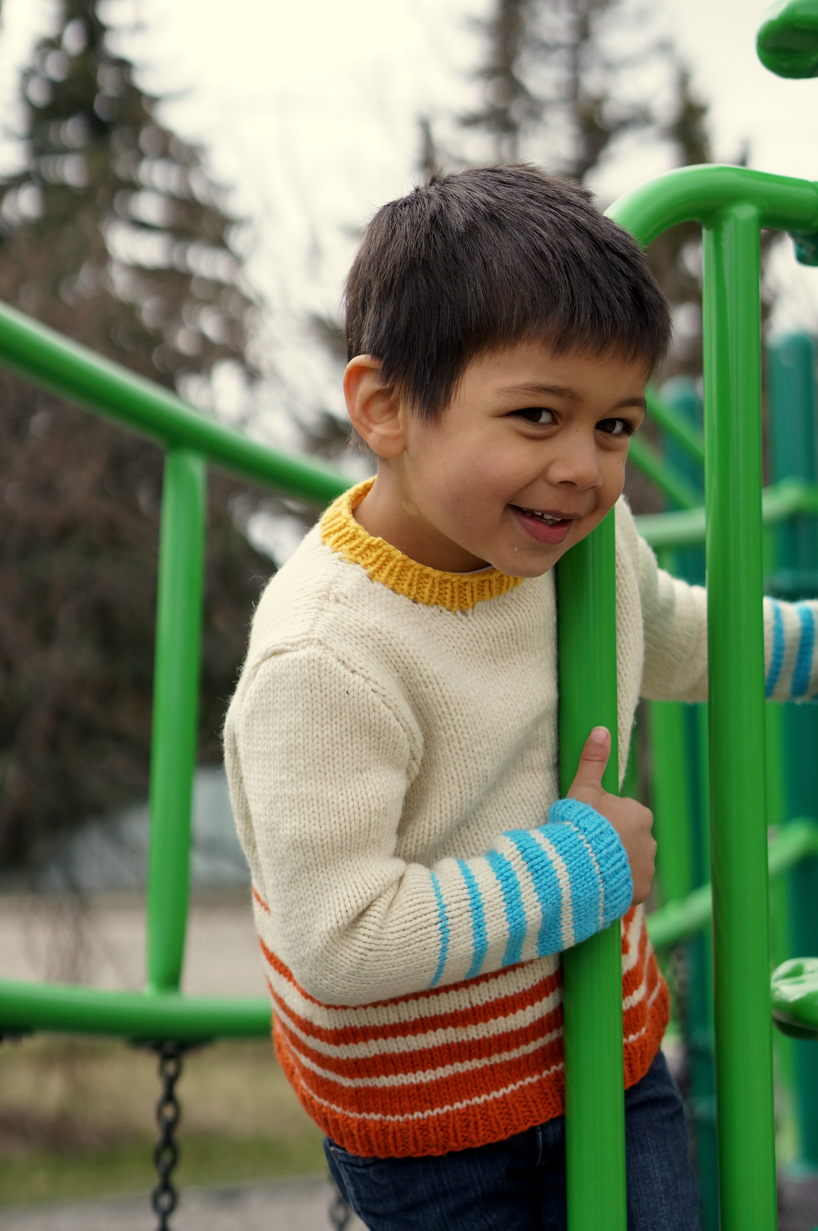 The sweater is very simple but the stripe pattern makes it lots of fun. The piece is designed with generous ease to fit over a shirt and to grow with the child.