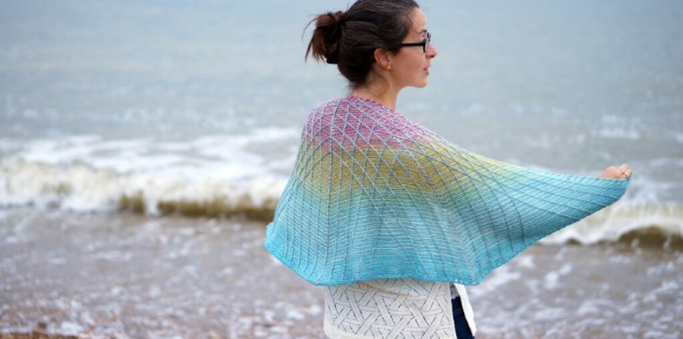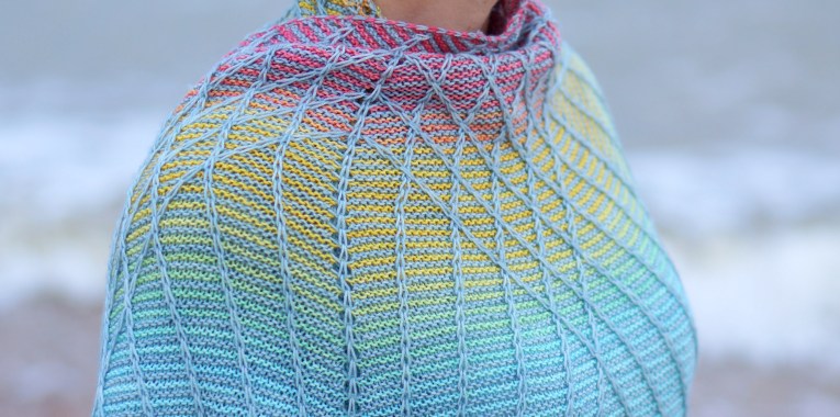 The first pattern is Lambton Panes. This is a top-down shawl featuring garter stitch stripes in a gradient (Cowtown colourway!!!) and a semi-solid, with slipped stitches travelling down to make a lattice pattern. The way the gradient changes through the background makes my heart sing!