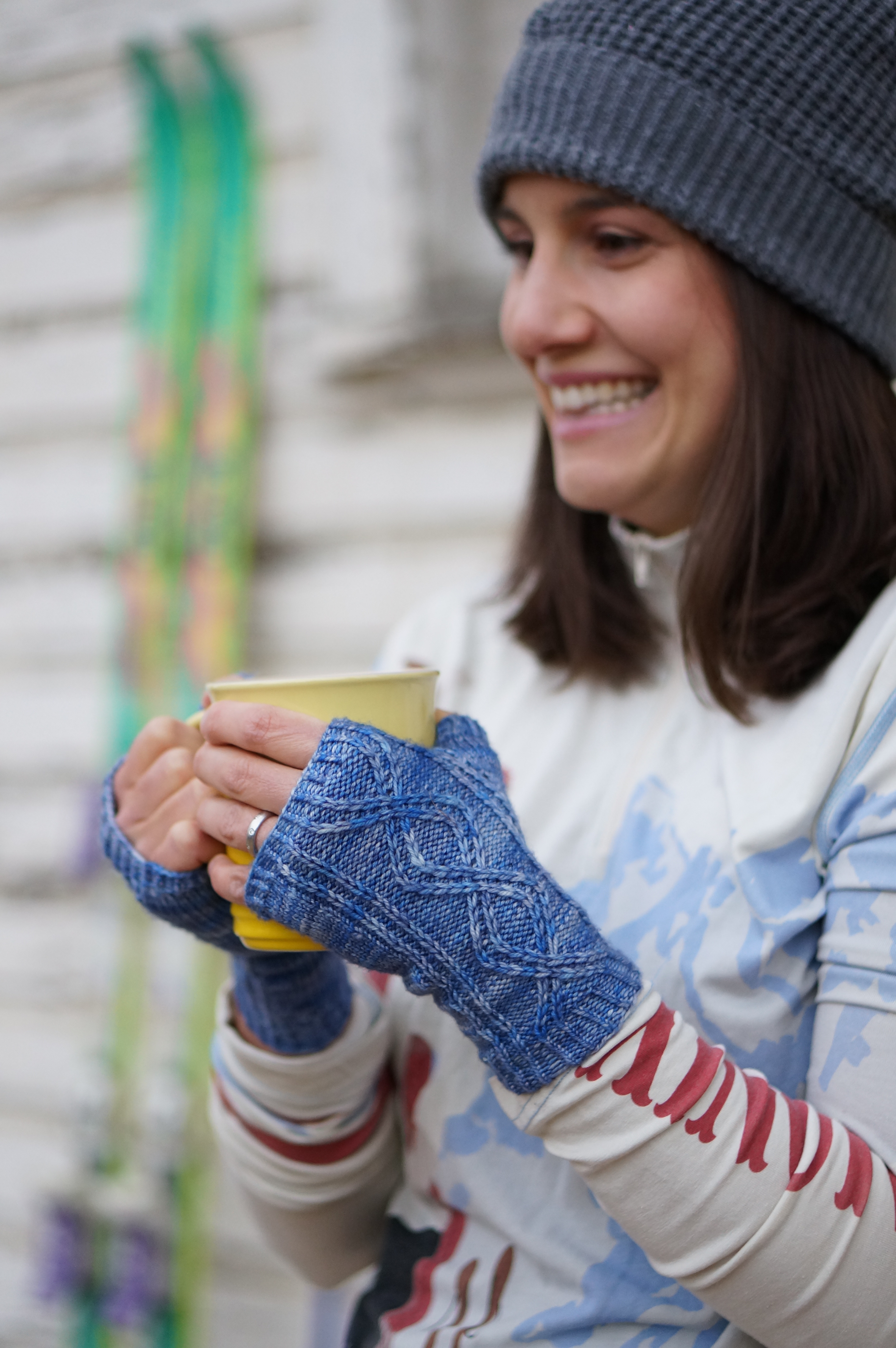 The Sunshine Fingerless Mitts feature a long cuff and gusseted thumb. The back of the mitt features a figure-eight cable pattern flanked by two sets of straight slipped stitch columns (those skiers were just bombing the run).